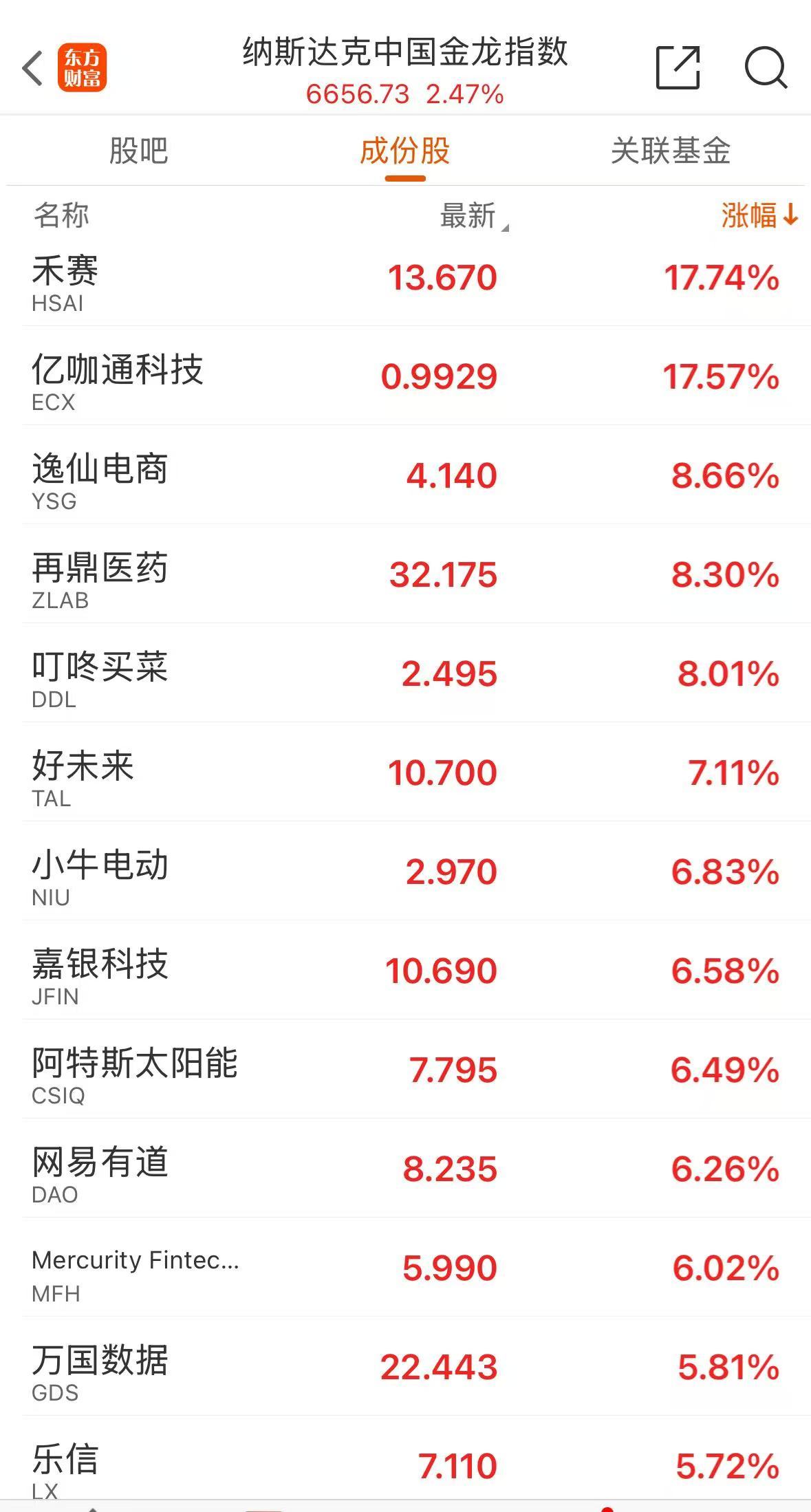 中概股方面,纳斯达克中国金龙指数明显强于美股多个指数,截至发稿涨逾2%,其中,禾赛、亿咖通科技涨超17%。另外,三倍做多富时中国ETF一度大涨超8%,两倍做多中国互联网股票ETF一度大涨超5%,