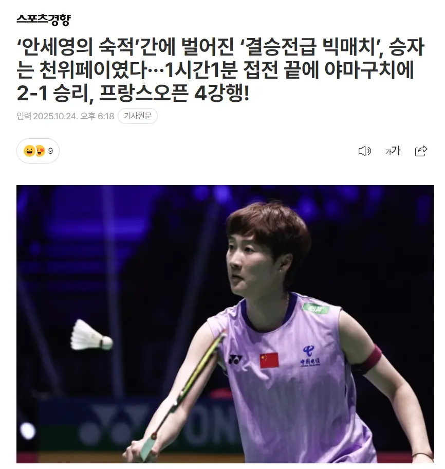 韩媒《体育倾向》发文盛赞陈雨菲:安洗莹宿敌之间的超级对决,陈雨菲2-1击败山口茜,陈雨菲将再一次与羽毛球女帝安洗莹交手。
