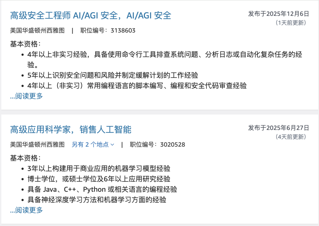 万人大裁员的同时,亚马逊还宣布对AWS投资500亿美元,用于扩建AI和基础设施。目前,在“亚马逊将在明年1月实行下一轮万人大裁员”的风声下,其官网依然挂出了机器学习顾问、AI应用科学家等多个AI相关职位。